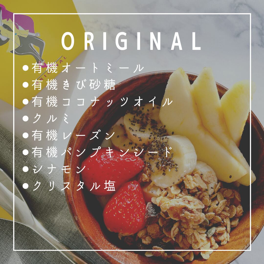 有機オートミール・有機きび砂糖・有機ココナッツオイル・くるみ・有機パンプキンシード・シナモン・クリスタル塩